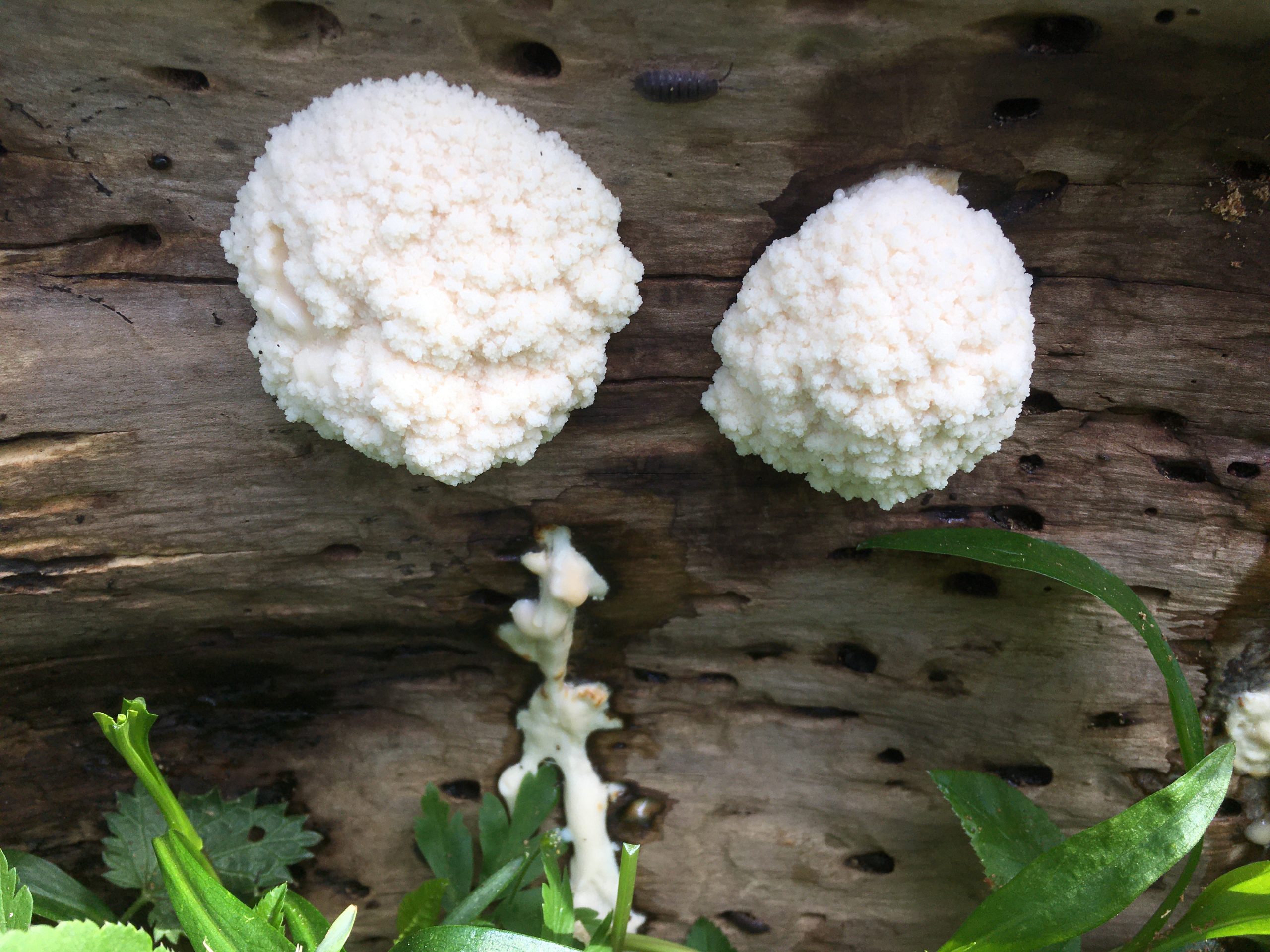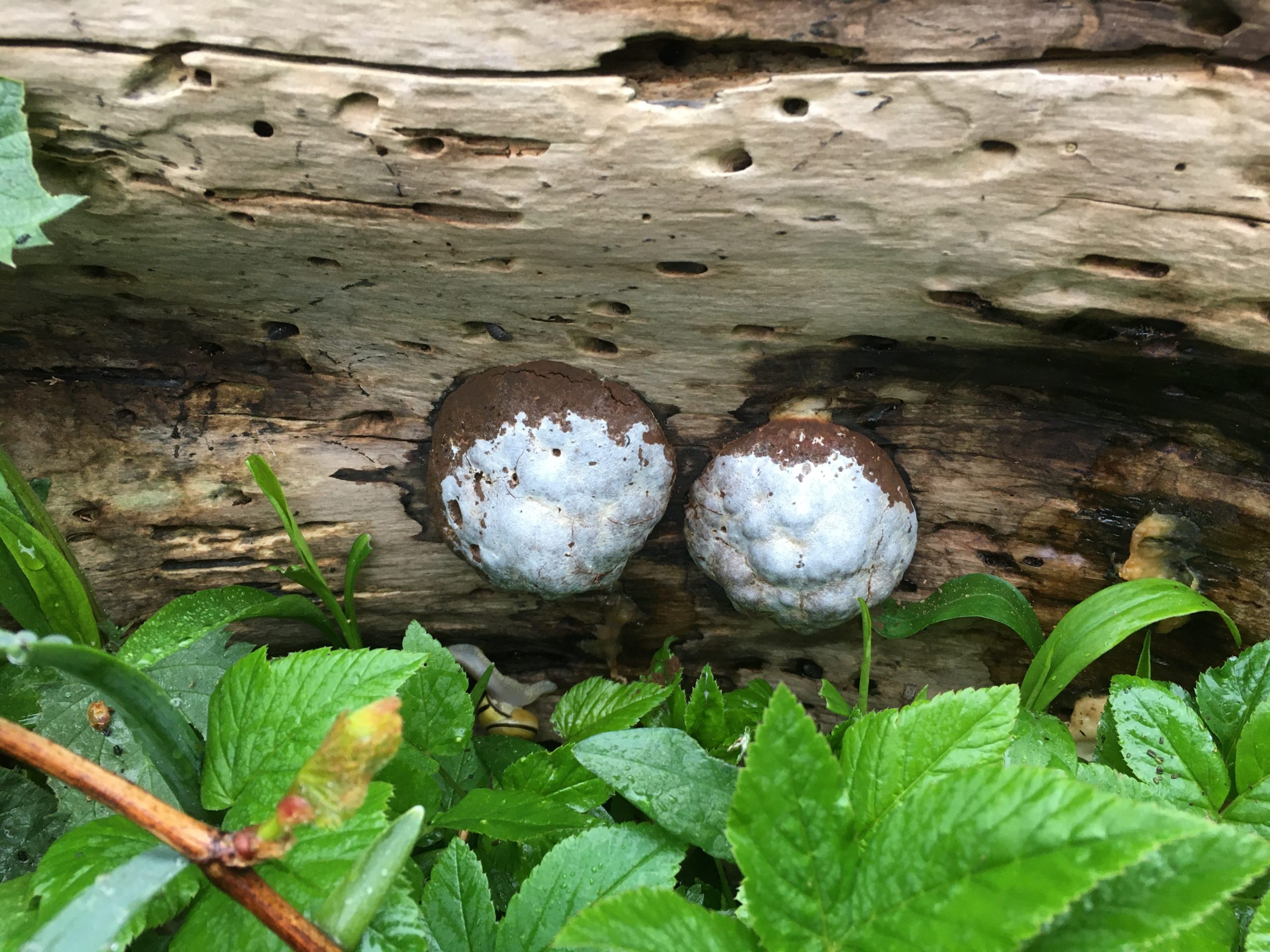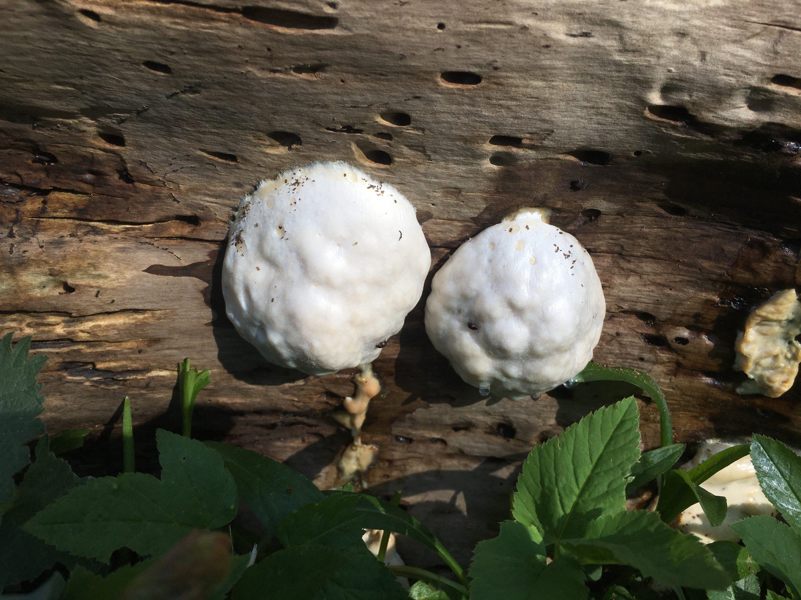 In der Natur wird alles wieder verwertet, auch ein abgestorbener Baum. Allerdings bekommt man die daran Beteiligten nur selten zu Gesicht. Sie leben im Verborgenen, unter der Rinde oder tief drinnen im Holz. Dieser weiße Kleks hat sich herausgetraut. Er hat etwa zehn Zentimeter Durchmesser und war zunächst schneeweiß. Mit seiner blumenkohlartigen Oberfläche sah er sogar zunächst ganz hübsch aus, dann wurde seine Oberfläche glatt und glänzend, zum Schluss von Rand her braun.