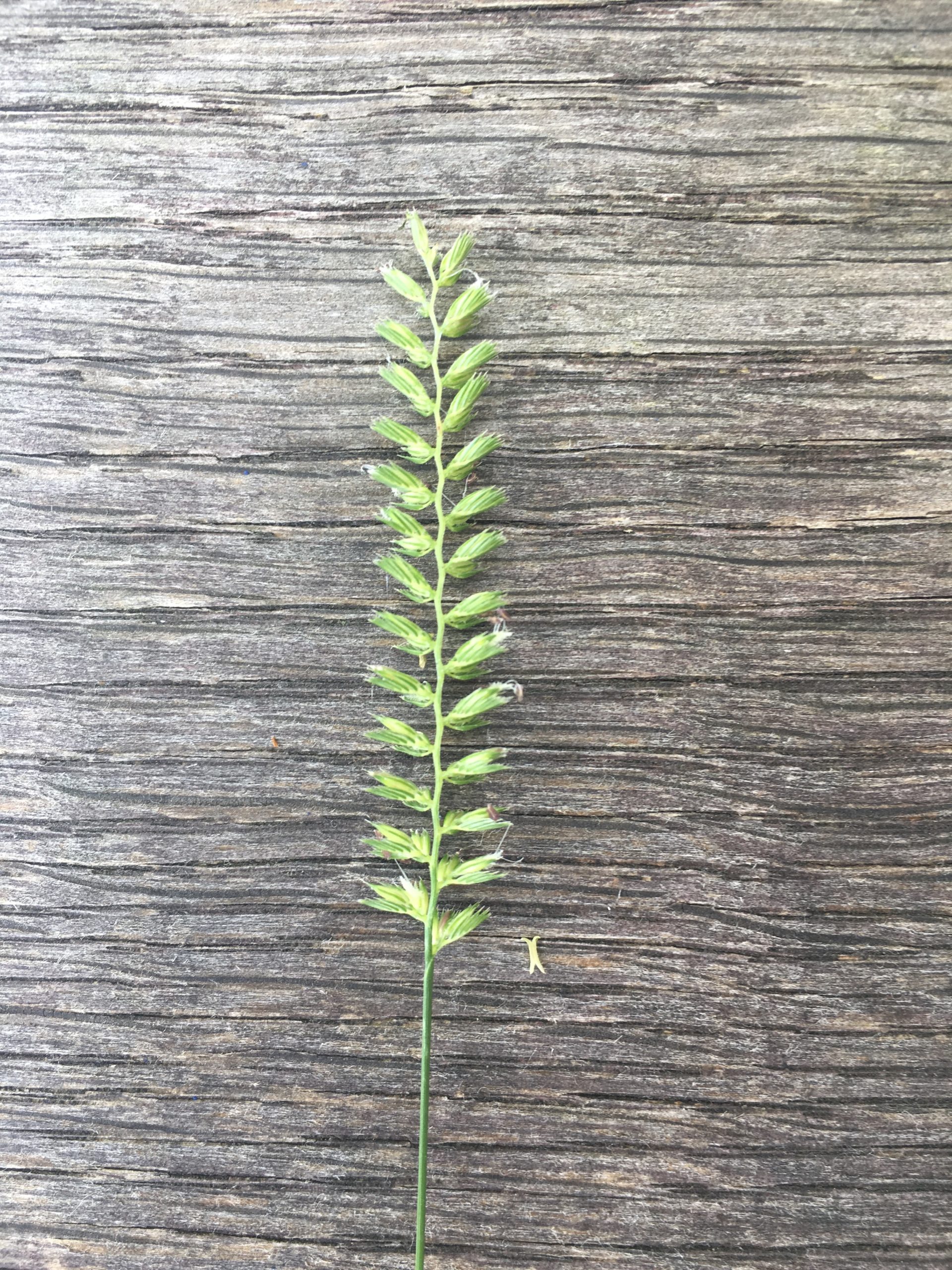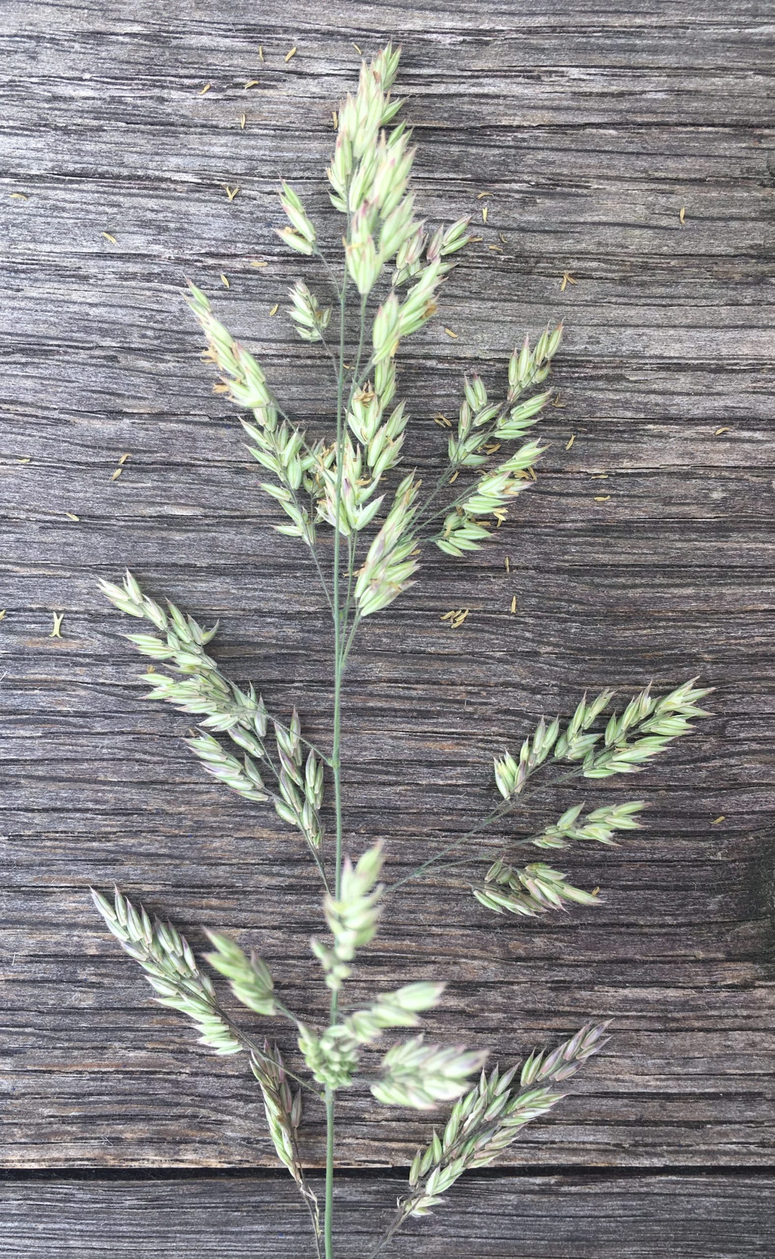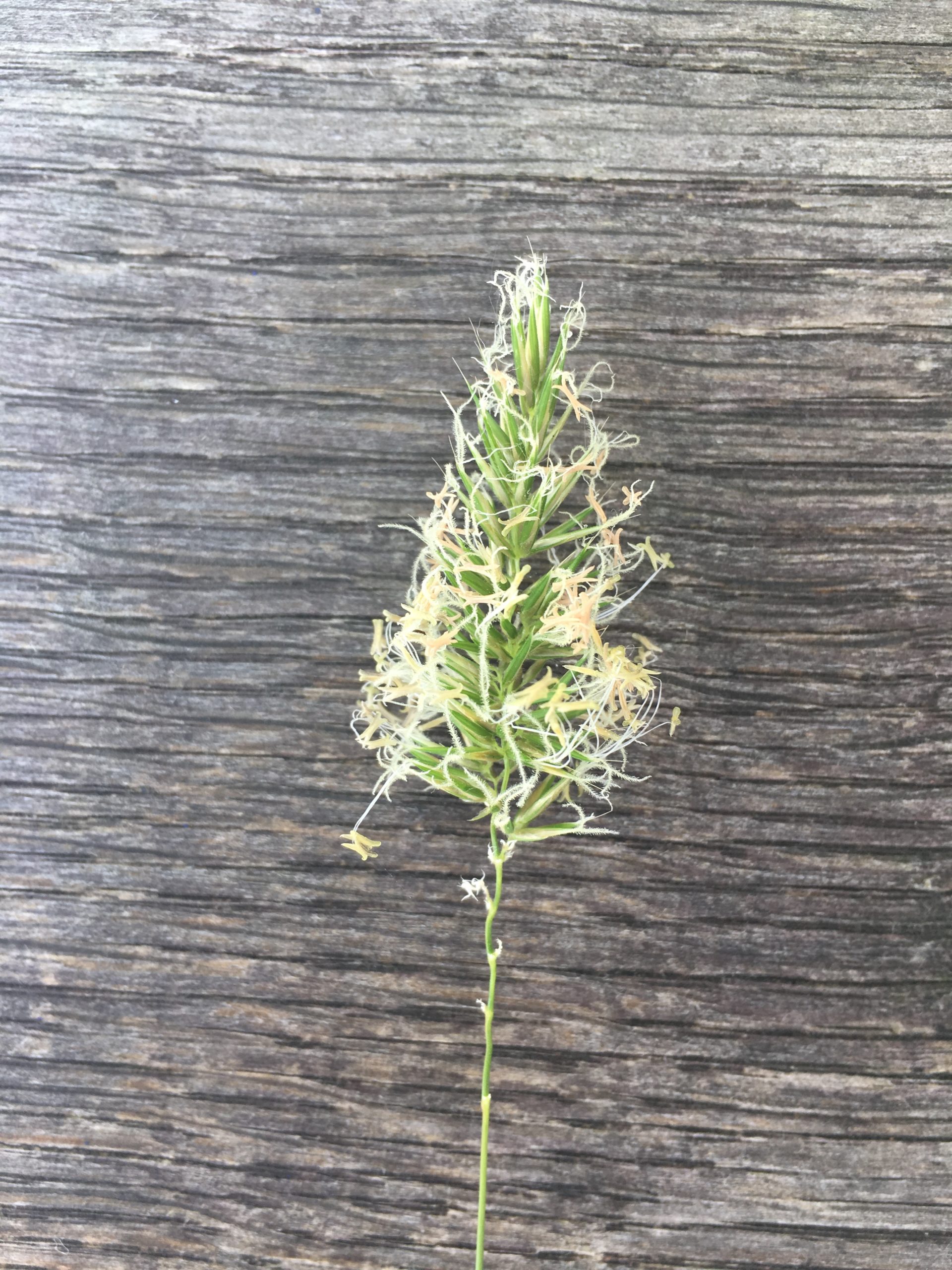 Mir ist der Futterwert meiner kleinen Wiese egal. Mir geht es um Vielfalt, eine Vielfalt, die noch vor 60 Jahren selbstverständlich war. Zur Vielfalt gehört die Weiche Trespe oder Flaum-Trespe (Bromus hordeaceus) mit ihren dicken Ähren, links. Sie gehört zu den „Ungräsern“, weil ihre Blätter schon vor der ersten Mahd vergilben und sie deshalb keinen Futterwert haben. Auch das Wohlriechende Ruchgras (Anthoxanthum odoratum) ist unerwünscht, zweites von links. Nach der Mahd duftet es nach Waldmeister, weil es eine Vorstufe des Cumarins enthält. Wer sich mit Medikamenten ein wenig auskennt weiß: Cumarin hemmt die Blutgerinnung, auch bei Nutztieren. Die wissen das und fressen es nicht.
